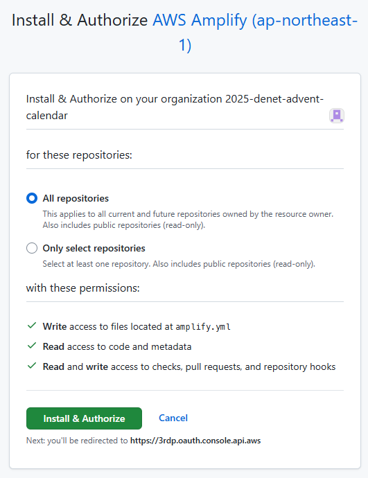 すべてのリポジトリを見せるか、特定のリポジトリを見せるか選択を求められたが、今回はすべてを選びました。