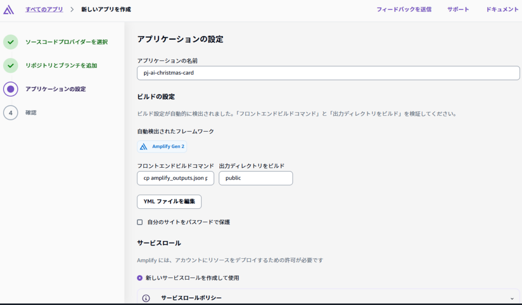 事前にリポジトリ内で、AmplifyのCIに関する設定ファイル(amplify.yml)を定義してあったので、自分で調整することなく次へ進められます。