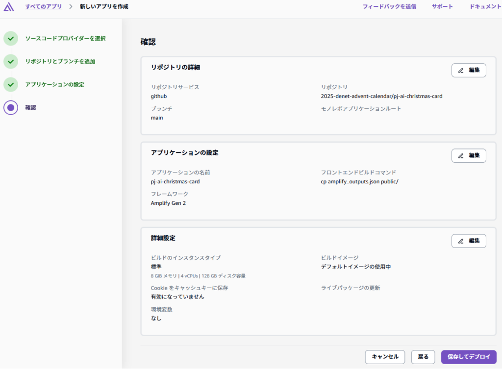 最終確認して問題がなければ、設定を保存して初回のデプロイが実行されます。