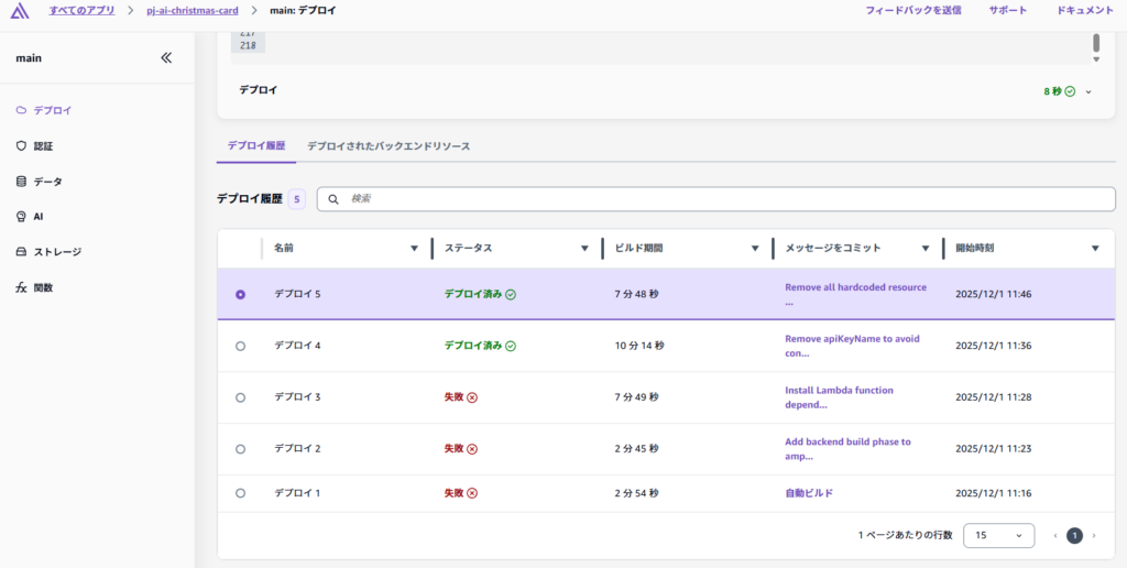 設定を保存した時点で、自動的にデプロイが開始されるので、一部失敗となっていますが、以下のような内容で、デプロイの状況を確認することができます。
