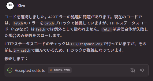Kiroのチャット欄に修正を依頼したファイルとプロンプトを渡して修正などを依頼しています。
