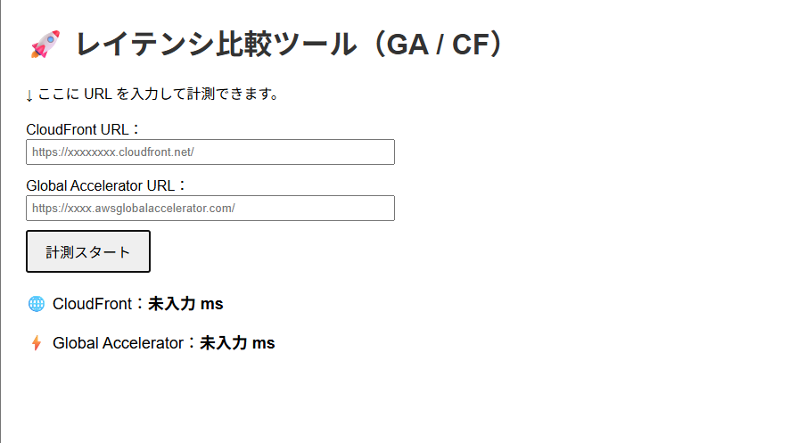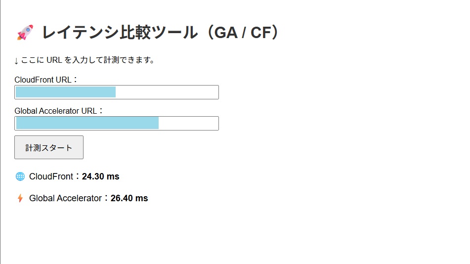 でここにさっき作ったCloudFrontのURLとGlobal AcceleratorのURLを入力すると…