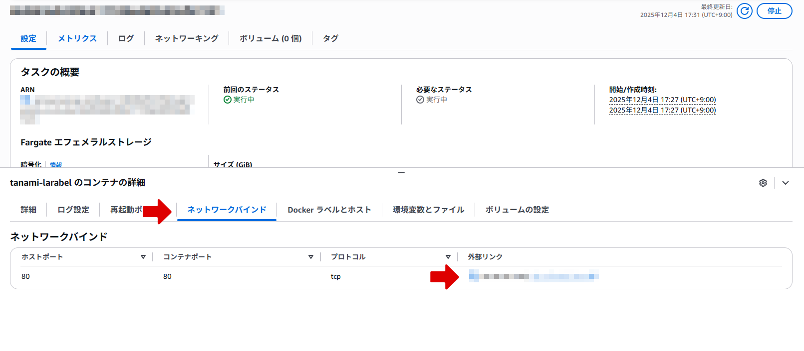 作成されたコンテナにはECSクラスターの「タスク」タブにある「ネットワークバインド」のIPから接続出来ます。