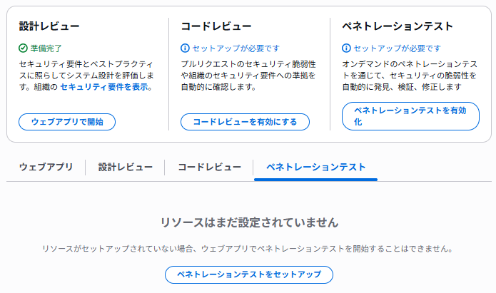 ペンテストの実施に向けて、ウェブアプリの画面から「ペネトレーションテスト」を選択し、詳細の設定を行います。