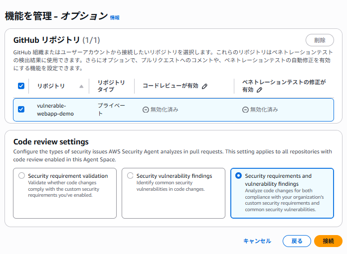 対象のリポジトリを選択し、レビューの設定を行います。とりあえず全部試したいので「Security requirements and vulnerability findings」を選択して接続します。