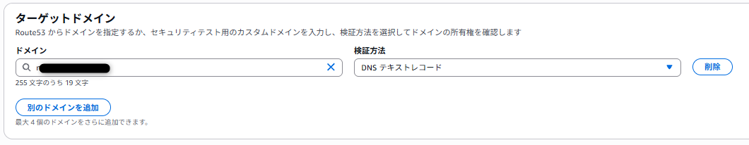 ターゲットドメインとして、診断対象のドメイン名の登録が必要です。Route53を使ってる場合は連携して手軽にDNSテキストレコードを使った検証が可能です。