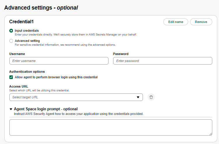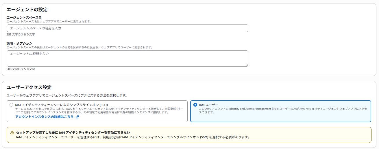 「エージェントスペース名」には任意の名前を付け、「ユーザーアクセス設定」はIAM Identity Center か IAMユーザー かを選びます。