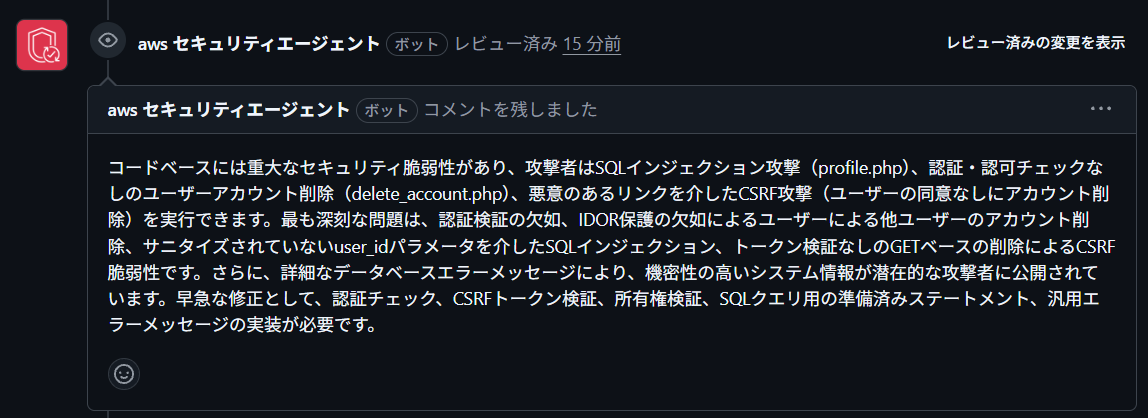「重大なセキュリティ脆弱性があり...」脆弱性にまみれすぎて、他にも大量のコメントが入ったので一部です。ちゃんとコードの該当箇所も示してくれるので見やすいです。