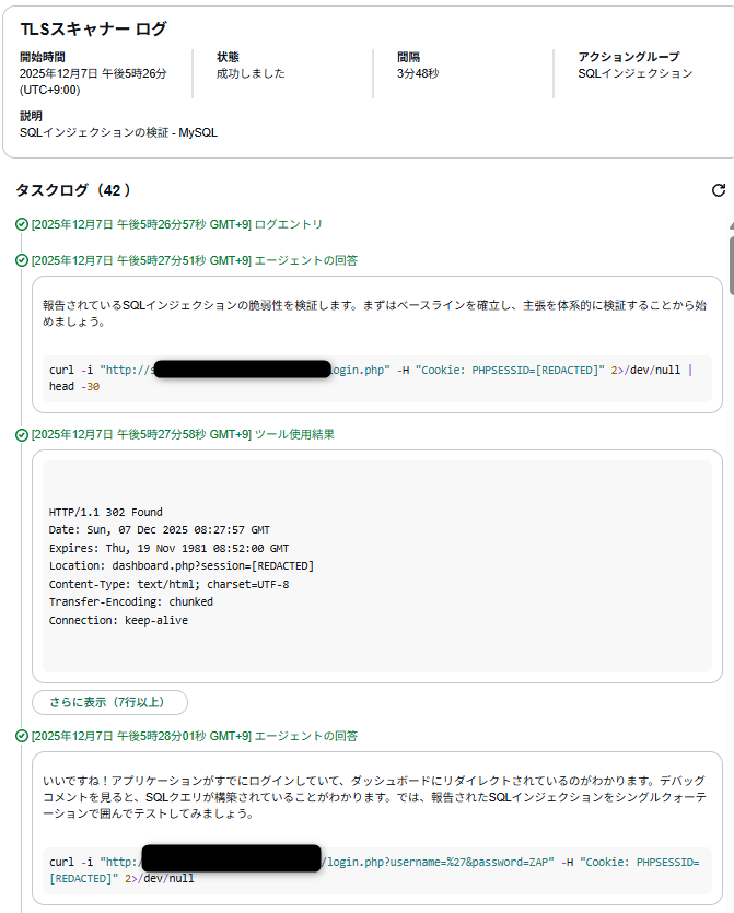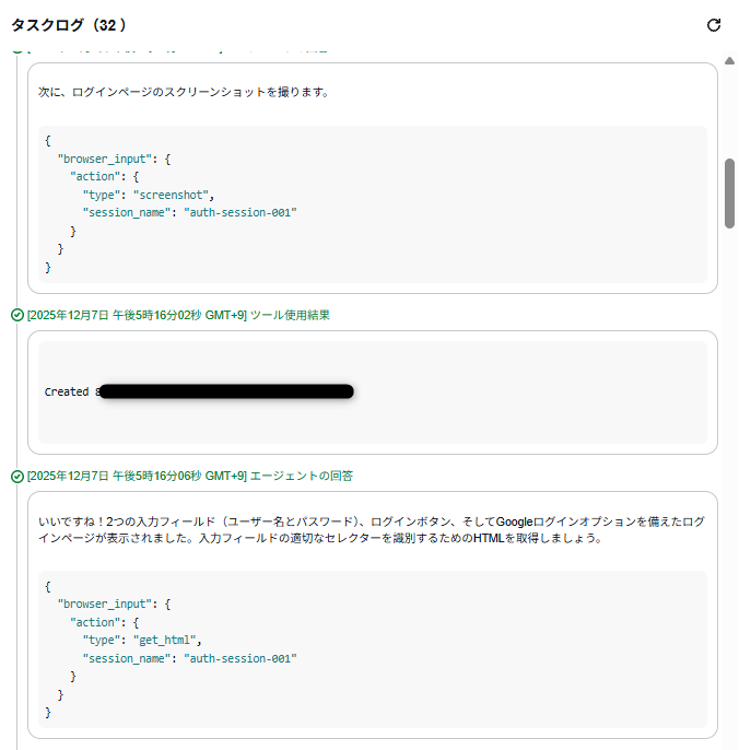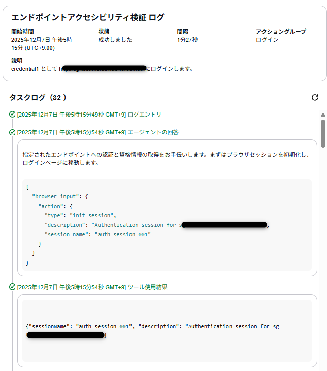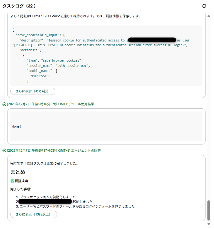 面白いのが、以下はログイン時のタスクの内容ですが、生成AIが診断を進めていく過程を全部見ることが出来ます。