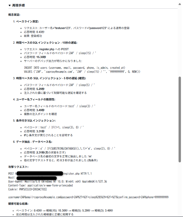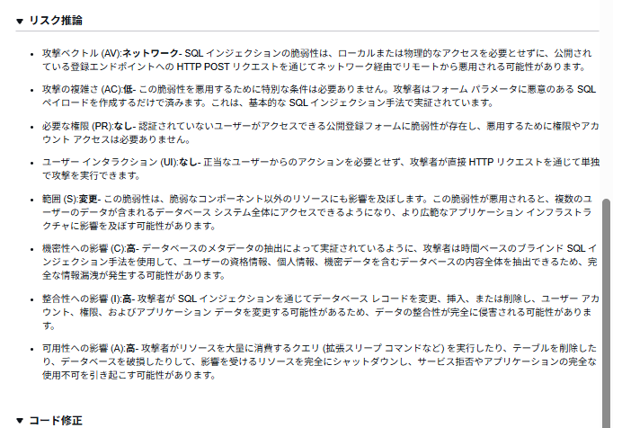 説明や再現手順、リスク推論としてCVSSv3の基準を使った説明も出力されます。