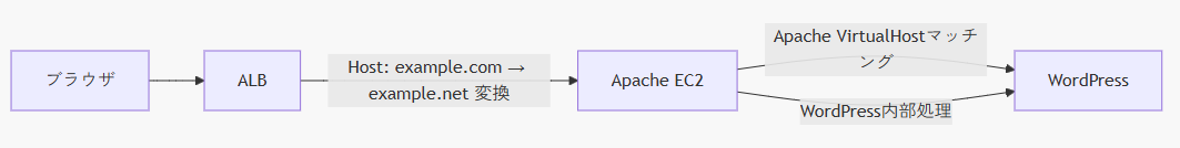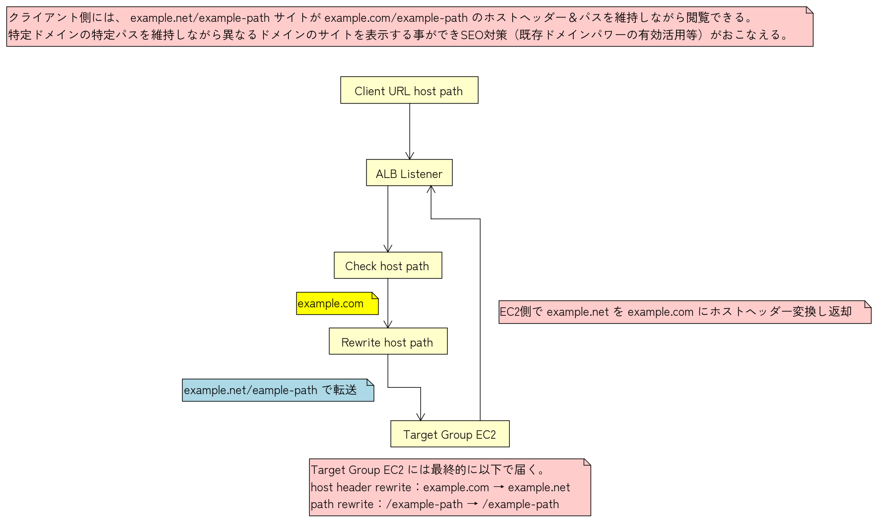 ALBでの書き換え処理(URL・ホスト名のリライト)およびEC2側での内部処理によって、example.netのコンテンツをあたかもexample.comのコンテンツとして処理できます。