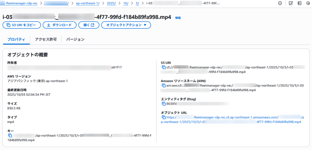 画面録画機能を利用することで、Fleet Manager経由で操作したリモートデスクトップ接続の画面が動画(mp4)として録画されて、S3バケットに保存されました。