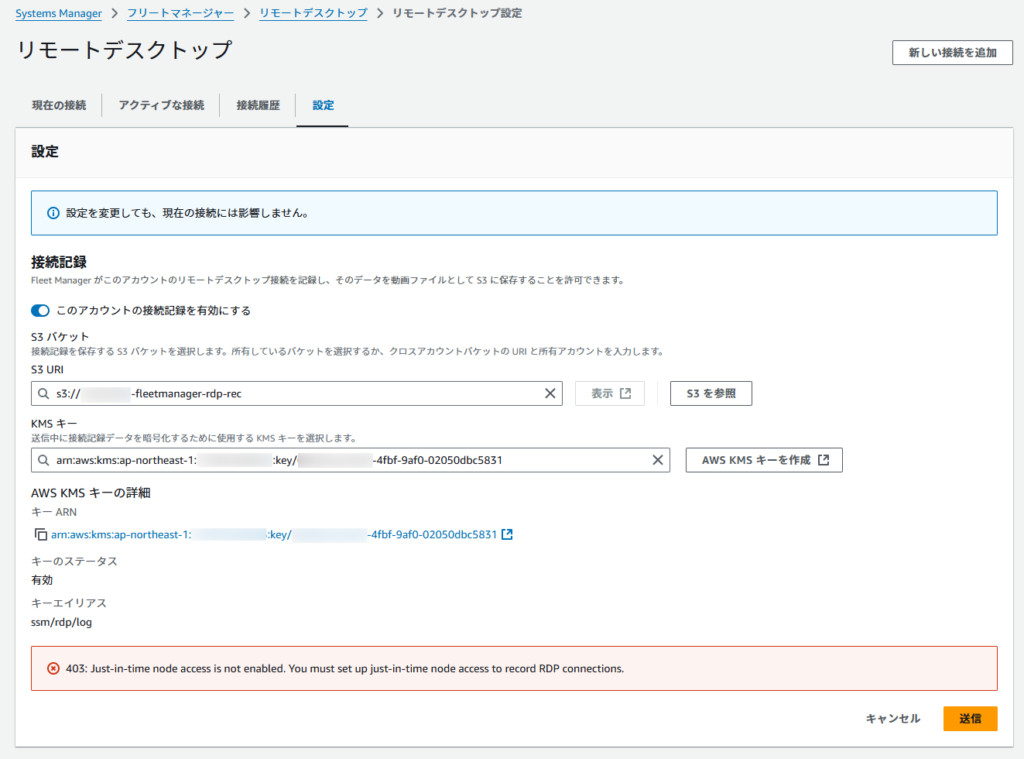 「ジャストインタイムノードアクセス」が無効だと、リモートデスクトップ接続記録を有効化できない。