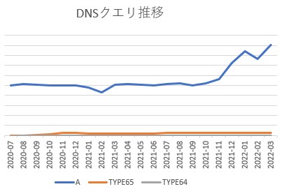 TYPE64、TYPE65ともに 2020年7月からクエリが伸び始め、約半年間増え続けた後少し減少してTYPE65(HTTPS)は徐々に上昇、TYPE64(SVCB)はグンと減少して低いところで推移しています。