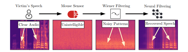 これはカリフォルニア大学アーバイン校の研究チームが開発した技術で、マウスの光学式センサーとAIを使って人の声で引き起こされる机の微細な振動をマウスのセンサーで検出して、それを音声に変換して会話を聞くのを可能にするっていう技術です。